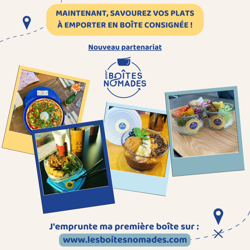 Les Boîtes Nomades sont une alternative zéro-déchets pour les repas à emporter. L’idée est de proposer aux restaurants des boîtes en verre consignées plutôt que d’utiliser des emballages jetables. Cela permet dans un premier temps de réduire les déchets, mais également de proposer une alternative plus durable tout en conservant au mieux la fraicheur des aliments.